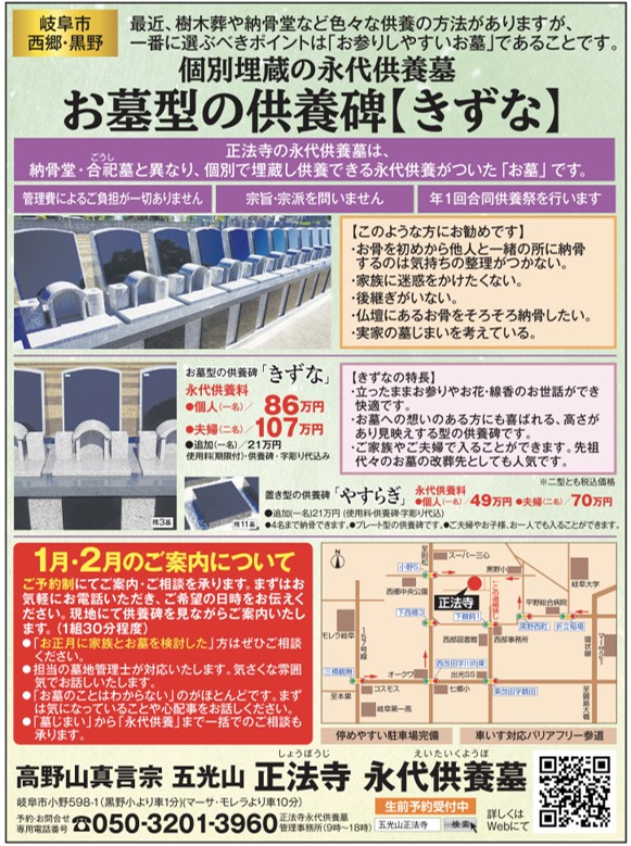 【本日の岐阜新聞】 5日の岐阜新聞朝刊本紙内に正法寺の広告がございます。『新年に、お墓を考える。』お電話はどうぞお気軽に。